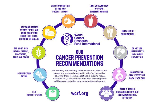 Ever wonder what to eat or not eat in order to decrease cancer risk? Check out the dietary and lifestyle suggestions from the World Cancer Research Fund.